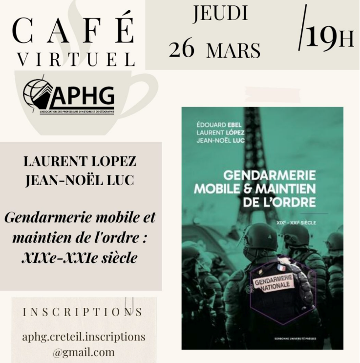 L'Association des professeurs d’histoire et de géographie vous convie à un café virtuel, pour une présentation du livre "Gendarmerie mobile et maintien de l’ordre, XIXe-XXIe siècle" par le Commandant Laurent López, Service historique de la Défense (SHD), et par le Pr Jean-Noël LUC, Sorbonne Université.